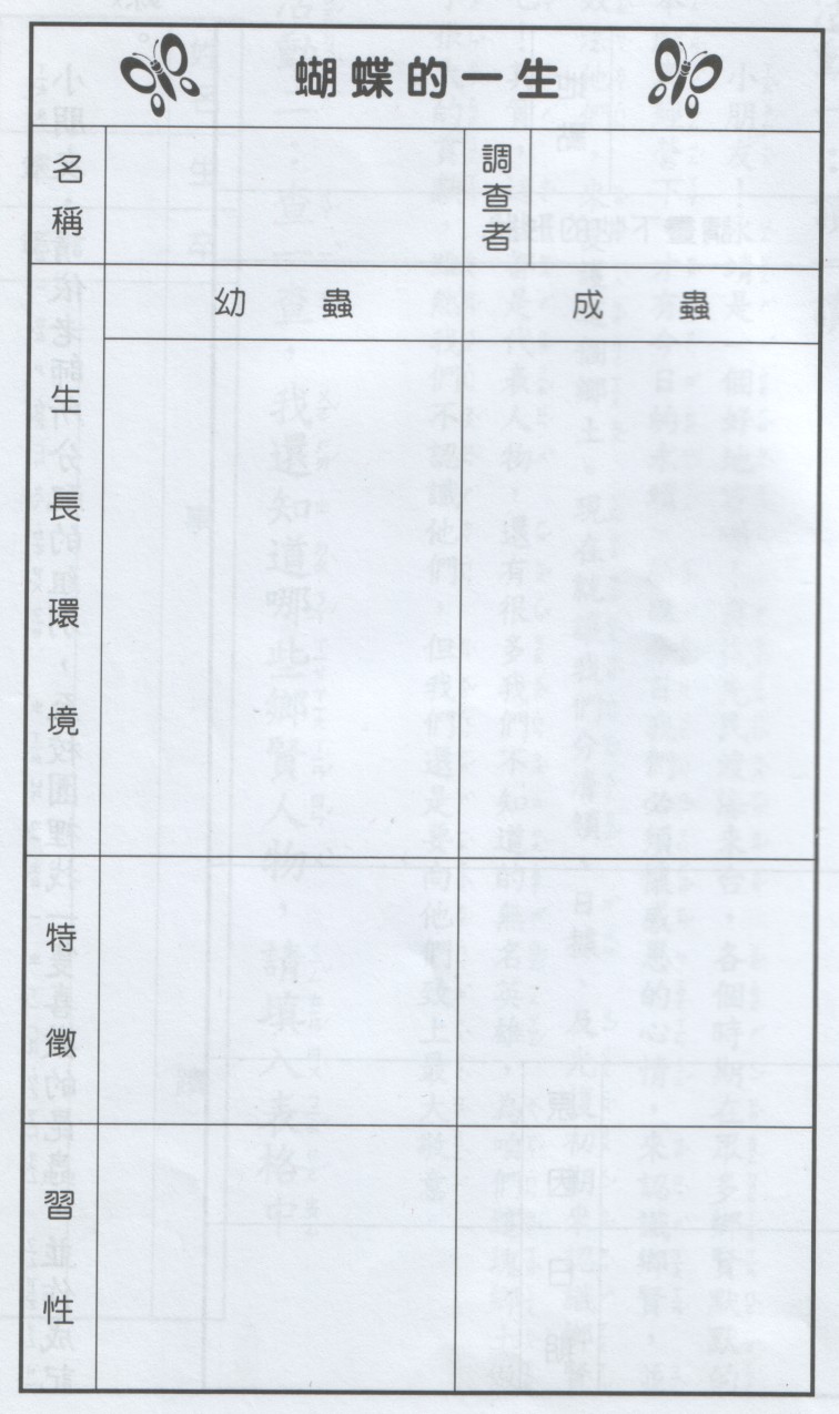 | 原野裡看到滿天飛舞的蝴蝶,總令人心曠神怡。小朋友,想不想多瞭解牠一點,請在老師的指導下到圖書室,將自己最常見的蝴蝶記錄下來。 |
