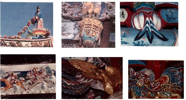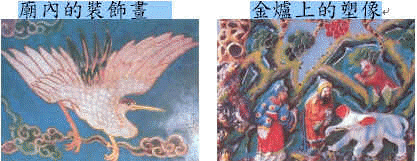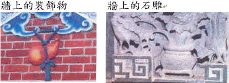 | 在寺廟中,有哪些裝飾品是木雕品?哪些是石雕品?哪些是彩繪藝術?請你把他們寫出來。 |